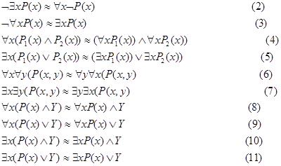 Р(х, у) не эквивалентны. Соотношения (8) - (11) позволяют формулу, не содержащую переменную х, выносить за пределы действия квантора, связывающего эту переменную.