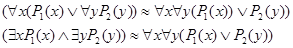 Используя соотношения (2, 3) можно выразить один квантор через другой. Соотношения (4, 5) показывают дистрибутивность квантора общности