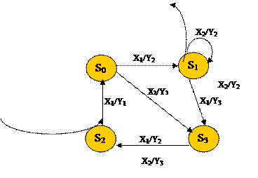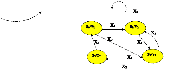 Каждому состоянию исходного автомата SiÎS ставится в соответствие множество пар вида (Si/Yj), где Yj, выходной сигнал, вырабатываемый автоматом при переходе в Si. Каждой такой паре в автомате Мура будет соответствовать состояние, т.е. состояние Si расщепляется на столько состояний, сколько различных выходных символов вырабатывается при переходе в Si.