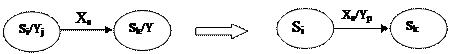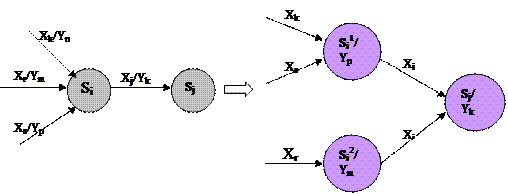 В приведенном фрагменте состояние Si расщепляется на два состояния – Si1 и Si2. Все переходы из состояния Si должны быть сохранены для состояний Si1 и Si2 эквивалентного автомата (рис. 5.11).