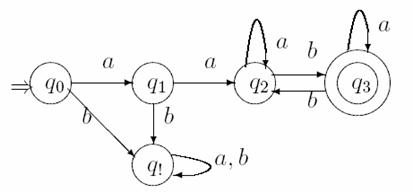 Для выделения слов, начинающихся на aa создадим начальное состояние q0, которое первый символ a будет переводить в состояние q1, а второй символ a будет переводить q1 в состояние q2. Ясно, что все слова, которые начинаются на ab, ba, bb сами не входят в язык L и все их продолжения также ошибочны. Заведем для них ошибочное состояние q!. Остальные слова естественно разбиваются на два класса: т.е., в которых четное число символов b, и те, в которых число таких символов нечетно (они и принадлежат L). Так как после получения aa число b четно, то для представления слов первого класса будем использовать состояние q2, а для представления слов второго создадим состояние q3, которое и будет заключительным. В результате получаем автомат, диаграмма которого представлена на рис. 5.14. Здесь начальное состояние отмечено стрелкой