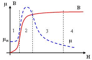 В области слабых полей (участок 2) магнитная проницаемость резко возрастает и проходит через максимум. В первой части этого участка рост магнитной индукции происходит очень круто.