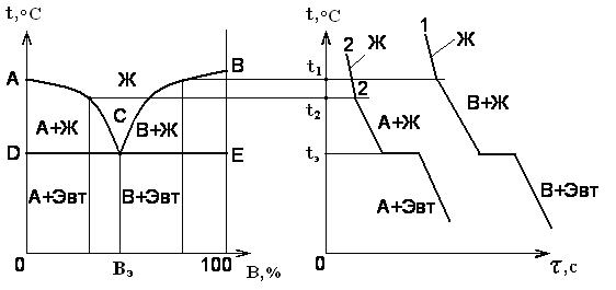 Рис.13. Диаграмма состояния I рода (а) и кривые охлаждения сплава (б)