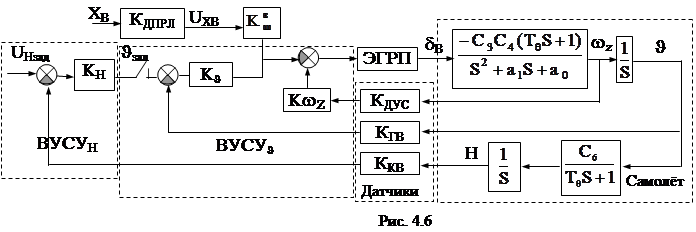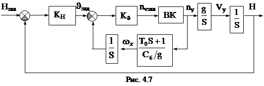 Структурная схема системы стабилизации высоты полета с контуром стабилизации угла тангажа, построенным на базе перегрузочного контура, представлена на рис. ниже:
