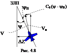 Т.е. самолет движется по заданной траектории, развернувшись по курсу на величину угла сноса.