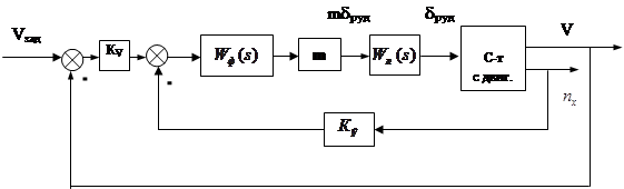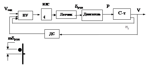 Основными элементами системы директорного управления рычагом управления двигателем являются вычислительное устройство (ВУ) и индиатор на лобовом стекле (ИЛС). На основе сигналов датчиков, характеризующих параметры движения самолета на заданной траектории, в ВУ вырабатывается командный сигнал, который используется для отклонения метки сектора газа (РУД). Задача летчика заключается в удержании метки РУД в нулевом (среднем) положении. Функциональная схема системы директорного управления РУД по индикатору представлена на рис. ниже