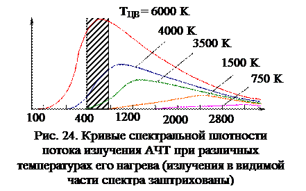- максимальная плотность потока излучения находится в видимой области спектра при нагреве излучателя до температур, лежащих в диапазоне от 3750 до 7800 К.