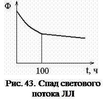 1. Номинальный световой поток Фн задаётся через 100 часов горения (отжига) ЛЛ. Этот объясняется тем, что у этих ИС в начале эксплуатации наблюдается достаточно быстрый спад светового потока (рис. 43). Этот процесс продолжается и в дальнейшем, но существенно замедляется. В целом для ЛЛ характерно большее уменьшение светового потока, чем у ЛН. По истечении средней продолжительности горения световой поток снижается на 20…30 % от первоначального.