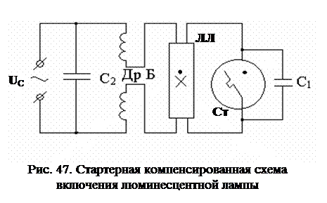 Основными элементами схемы наряду с ЛЛ являются балластный дроссель ДрБ, включённый последовательно с электродами ЛЛ, и так называемый стартер Ст тлеющего разряда.