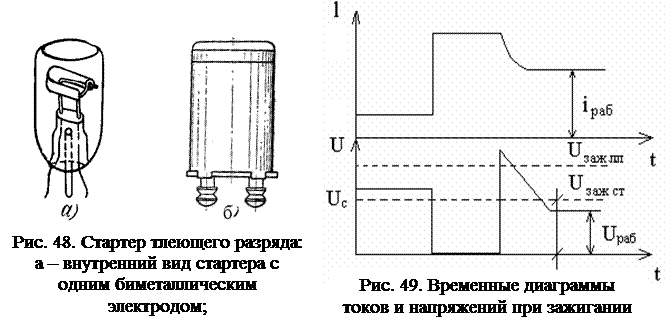 Стартер представляет собой небольшое термоионное реле, созданное на основе неоновой лампы (рис. 48). Основными частями стартера являются колба, заполненная неоном, цоколь, контакты для подвода напряжения и два электрода. Один электрод – неподвижный, а второй – подвижный биметаллический из двух спаянных металлических пластин с разны-