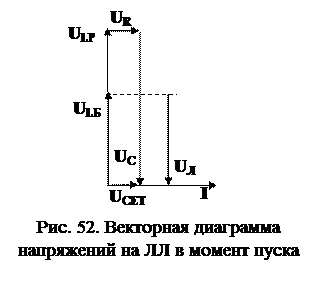 Кроме того, при резонансе напряжений, как известно, частичные напряжения (т.е. напряжения на индуктивности и на ёмкости) значительно превышают напряжение, поданное в схему. Хотя в этой схеме к ЛЛ подводится не частичное напряжение, а его часть (рис. 52), оно, тем не менее, существенно больше сетевого, что и обеспечивает зажигание ЛЛ.