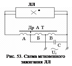 В схемах мгновенного зажигания предварительный прогрев электродов ЛЛ не осуществляется. Пуск ЛЛ производится при холодных электродах. Напряжение холодного зажигания ЛЛ в 2…3 раза выше напряжения горячего зажигания. Поэтому в таких схемах на ЛЛ в первоначальный момент подаётся напряжение до 1,5 кВ. Один из возможных вариантов схемы представлен на рис. 53.