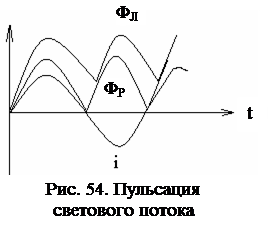 Пульсация светового потока вызывается тем, что при частоте питающего напряжения 50 Гц ток i через РЛ проходит через ноль 100 раз в секунду (рис. 54). Соответственно 100 раз в секунду будет снижаться до нуля и поток ФР излучения РЛ. Благодаря тому, что люминофоры обладают послесвечением (излучают световой поток некоторое время после снятия облучения ультрафиолетом), световой поток ФЛ ЛЛ снижается не до нуля, а примерно наполовину.