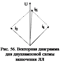 Для создания сдвига фаз между токами этих ламп последовательно с одной из них (ЛЛ2) включается конденсатор. В результате ток первой лампы носит активно-индуктивный (отстающий) характер (рис. 56) с коэффициентом мощности около 0,5, а у второй – активно-ёмкостный (опережающий) с таким же, но опережающим коэффициентом мощности. Результирующий ток носит отстающий характер, обеспечивая коэффициент мощности не ниже 0,92.