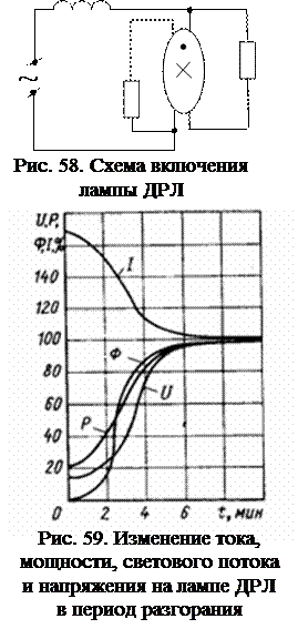 Для зажигания ламп ДРЛ характерно наличие периода разгорания, достигающего пяти-семи минут (рис. 59). В течение этого периода основные характеристики лампы претерпевают изменение вследствие изменения давления паров ртути в горелке – у ламп мощностью 80 Вт давление повышается до 106 Па, у ламп 1000 Вт – до 2,5·105 Па. В частности, пусковой ток лампы в два раза превышает номинальный.