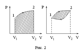 (рис. 2). При этом работа равна площади заштри-хованной фигуры под кривой, описывающей данный процесс. В круговом процессе система возвращается в исходное состояние (рис. 2). В этом случае работа по пути 1 – 2 положительна, а по пути 2 – 1 отрицательна. Полная работа равна площади заштрихованной фигуры внутри замкнутого контура на плоскости