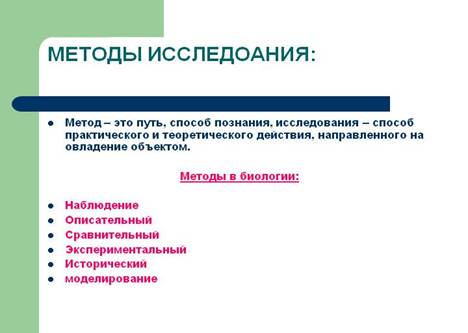 Биология многогранна и поэтому нуждается в систематизированных и разносторонних методах изучения. Выделяют следующие методы исследования, которые изображены на