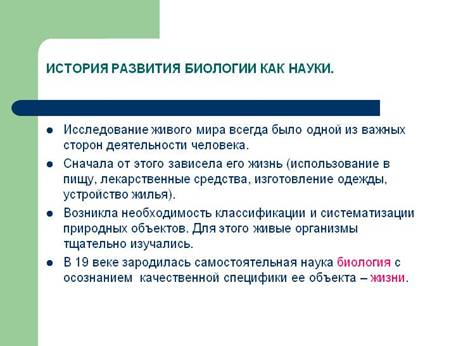 Первобытный человек был первым, кто стал непроизвольно накапливать первые знания о живых организмах. Живые организмы были пищей, материалом для одежды и жилья первобытного человека. Уже тогда надо было знать все о растениях, животных, особенностях их поведения. Вот так потихоньку стали накапливаться знания о всем живом, что окружало человека.