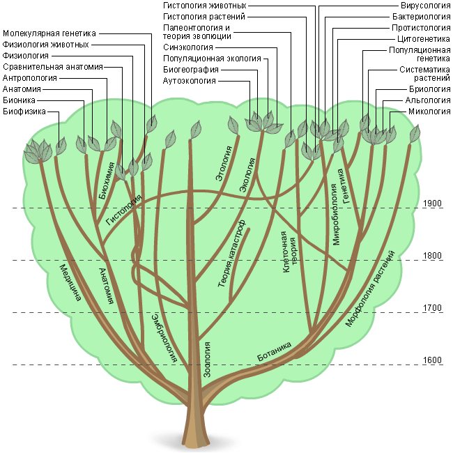 В настоящее время биология условно разделяется на две большие группы наук. Биология организмов (сюда входит науки о растениях (ботаника), животных (зоология), грибах (микология), микроорганизмах (микробиология) изучает отдельные группы живых организмов, их внутреннее и внешнее строение, образ жизни, размножение и развитие. Общая биология изучает жизнь на различных уровнях: молекулярном (молекулярная биология, биохимия и молекулярная генетика), клеточном (цитология), тканевом (гистология), на уровне органов и их систем (физиология, морфология и анатомия), популяций и природных сообществ (экология).