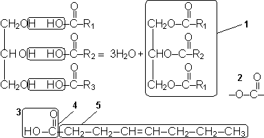 1 — триглицерид; 2 — сложноэфирная связь; 3 — ненасыщенная жирная кислота;