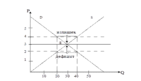 1. Пусть предлагается цена 2 рубля. Эта цена не будет равновесной, так как при Р=2 руб. QD=40, а QS=20, и следовательно возникает дефицит товара.
