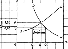 С одной стороны, быстрый рост цен на масло способствовал развитию инфляции, с другой исключат из числа покупателей масла те семьи, чьи денежные доходы не поспевали за быстрым ростом стоимости жизни. Поэтому, чтобы противодействовать инфляции и сохранить масло на столах бедняков, правительство установило потолок цены (Р) на уровне, скажем, 90 центов за фунт. Заметьте, что установление потолка цены имеет смысл при условии, что он ниже равновесной цены. Потолок цены, скажем, 1,5 дол. не оказал бы никакого непосредственного воздействия на рынок масла.