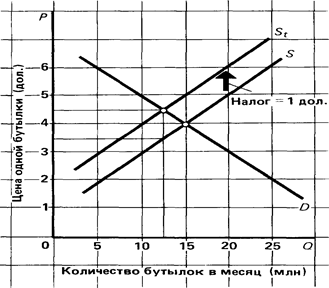 Тщательное сравнение соотношения между спросом и предложением после введения налога с доналоговым равновесием между ними показывает, что если цена до введения налога была равна 4 дол. за бутылку, то новая равновесная цена составляет 4,5 дол. В данном конкретном случае половину налога платят потребители в виде более высокой цены, а другую половину – производители в виде более низкой цены после уплаты налога. Потребители платят за бутылку на 50 центов больше, а производители, заплатив государству 1 дол. налога на единицу продукции, получат 3,5 дол., то есть на 50 центов меньше той цены в 4 дол., которая была установлена до введения налога. В этом случае потребители и производители делят налоговое бремя поровну; производители переносят половину налога на потребителей в виде более высокой цены, а вторую половину налогового бремени несут сами.