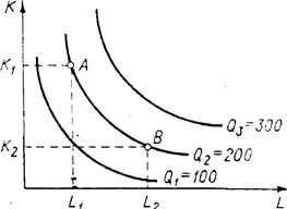 характеризующая зависимость между максимально возможным объемом выпуска (Q) и количествами применяемых ресурсов труда (L) и капитала (К). Это объясняется не только удобством графического отображения, но и тем, что удельный расход материалов во многих случаях слабо зависит от объема выпуска, а такой фактор, как производственные площади, обычно рассматривается вместе с капиталом. При этом ресурсы L и К, а также выпуск Q рассматриваются в мере потока, т.е. в единицах использования (выпуска) в единицу времени. Графически каждый способ производства может быть представлен точкой, координаты которой характеризуют минимально необходимые для производства данного объема выпуска количества ресурсов L и К, а производственная функция – линией равного выпуска, или изоквантой, подобно тому как в теории потребления кривая безразличия характеризует один и тот же уровень удовлетворения, или полезности различных комбинаций потребительских благ. Таким образом, на карте выпуска каждая изокванта представляет множество минимально необходимых комбинаций производственных ресурсов или технически эффективных способов производства определенного объема продукции. Чем дальше от начала координат расположена изокванта, тем больший объем выпуска она представляет. При этом в отличие от кривых безразличия каждая изокванта характеризует количественно определенный объем выпуска. Так, на рис. 7.1 приведены три изокванты, соответствующие выпуску 100, 200 и 300 единиц продукции, так что мы можем сказать, что для выпуска 200 единиц продукции нам необходимо либо К1 единиц капитала и L1 единиц труда, либо К2 единиц капитала и L2 единиц труда, либо какая-то другая их комбинация из множества, представленного изоквантой Q2 = 200.