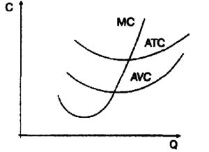 Кривая предельных издержек круто опускается вниз, достигает своего минимума и затем довольно круто идет вверх. Это отражает тот факт, что переменные издержки, а следовательно, и общие издержки сначала растут убывающими, а затем нарастающими темпами.