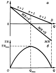 Следуя аксиоме рациональности производителя, разумно предположить, что монополист выберет такой объем, при котором прибыль (а в нашем случае она равна выручке ввиду отсутствия затрат) будет максимальной. Это означает, что для ответа на поставленный Курно вопрос необходимо знать, как изменяется общая, а следовательно, и предельная (т. е. приращение общей) выручка при изменении объема выпуска.