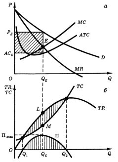 Проиллюстрируем эти результаты графически. На рис. 12.3, а изображены линия спроса на продукцию предприятия-монополиста, кривые его предельной выручки, средних и предельных затрат, а на рис. 12.3, б - линия общей выручки и общих затрат монополиста. Монополист получает положительную прибыль в интервале объемов выпуска Q 1 Q 2, где линия общей выручки расположена выше линии общих затрат. Своего максимального значения, равного длине отрезка LM, эта прибыль достигает при объеме выпуска QE, когда расстояние между кривыми TR и TC максимально. Заметим, что при выпуске QE наклон кривой TR в точке L равен наклону кривой ТС в точке М (касательные к кривым ТR и TC в точках L и М соответственно параллельны), т. е. МR = MC. Это можно увидеть и на рис. 3, а, где при объеме выпуска QE кривые MR и MC пересекаются (MR = МС). Итак, фирма-монополист получает максимальную прибыль при выпуске QE единиц товара, которые реализуются на рынке по цене РЕ (рис. 12.3, а).