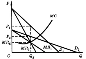Предположим сначала, что монополист сталкивается с кривой спроса D 1. Тогда монополист максимизирует свою прибыль при объеме выпуска QE, которому соответствует цена P 1. Представим теперь, что кривая спроса на продукцию монополиста D 2. Объем выпуска, максимизирующий прибыль фирмы, QE (как и в первом случае), однако цена реализации этого объема на рынке уже иная - P 2. Таким образом, при различных кривых спроса различным уровням цены соответствует один и тот же оптимальный объем выпуска фирмы-монополиста (а одному и тому же уровню цены - разные оптимальные объемы выпуска), что означает невозможность построения кривой предложения такой фирмы.