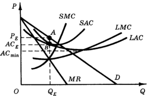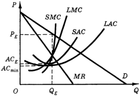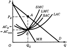 Понятно, что монополист достигает максимальной прибыли при таком объеме выпуска, при котором предельная, выручка равна долгосрочным предельным затратам: MR = LMC. Какой же размер завода выберет монополист для достижения этой цели? На рис. 12.6 при объеме производства QE выпуск продукции осуществляется на заводе, размер которого характеризуется кривой средних затрат по выпуску продукции SAC. Как-видно из рис. 12.6, этот размер меньше оптимального, т.е. такого, при котором достигается минимум долгосрочных средних затрат LAC min. Но даже и для этого завода объем выпуска QE не обеспечивает минимум краткосрочных средних затрат - увеличение выпуска позволило бы снизить средние затраты (иными словами, завод имеет некоторую избыточную мощность).