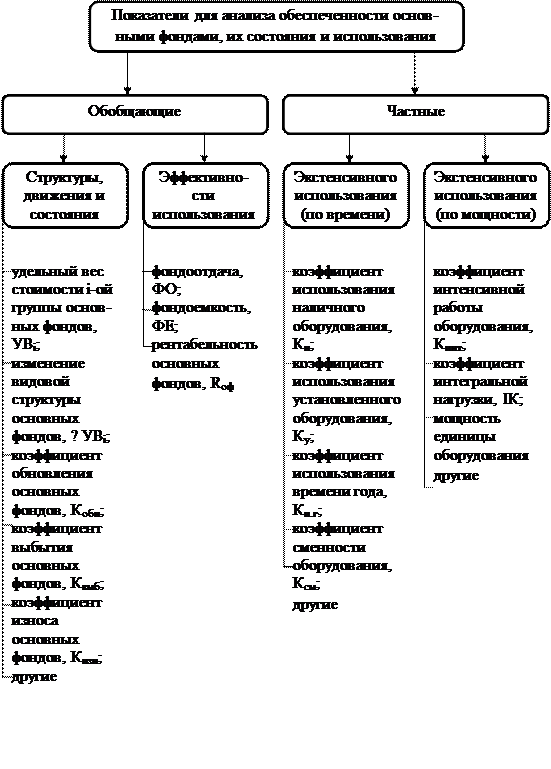 С помощью показателей первой группы (обобщающие) анализируют структуру, движение и состояние основных фондов предприятия, а также эффективность их использования. С помощью показателей второй группы (частных) анализируют уровень экстенсивного, либо интенсивного использования основных фондов предприятия.