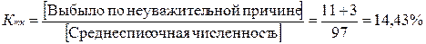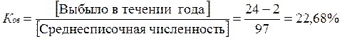 Текучесть кадров определяется отношением абсолютной текучести (количество выбывших работников по неуважительной причине) к среднесписочной численности (или количество уволившихся по собственному желанию + нарушения трудовой дисциплины):