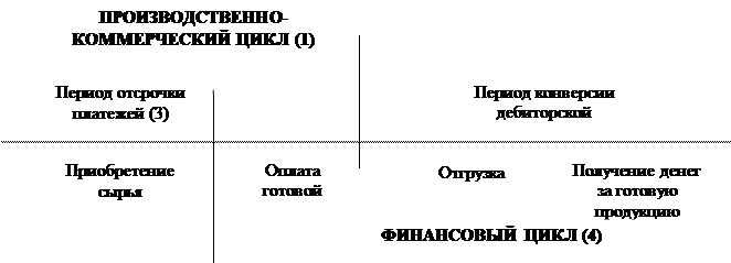Еще одним важным понятием в управлении оборотными активами является понятие финансового цикла – период оборота денежных средств вложенных в оборотные активы, начиная с момента погашения кредиторской задолженности за сырье и заканчивая инкассацией дебиторской задолженности ((4)=(1)+(2)-(3)).