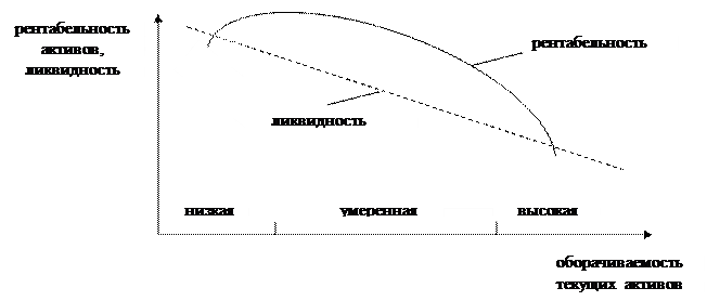 При низкой оборачиваемости текущих активов, компания обладает большим объемом оборотных средств и, следовательно, минимальным риском потери ликвидности при прочих равных условиях. При этом рентабельность активов снижается, поскольку предприятие теряет потенциальную прибыль. При крайне высокой оборачиваемости текущих активов их уровень может оказаться недостаточным для поддержания ликвидности, а также производственного процесса, что значительно увеличивает риск и ведет к потерям прибыли.