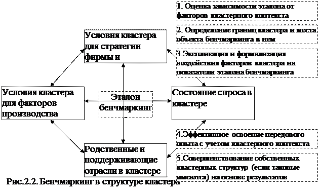 Целью исследования кластерного контекста объектов бенчмаркинга является понимание того, как кластер влияет на формирование эталонных показателей предмета бенчмаркинга, и освоение позитивного опыта взаимодействия внутри кластеров в собственной практике. Без учета кластерного контекста важные ключевые факторы успеха, особенно в промышленности и в машиностроении, могут оказаться вне поля зрения исследователя, так как сегодня значительная часть потенциала компаний лежит вне её границ и даже вне отрасли.