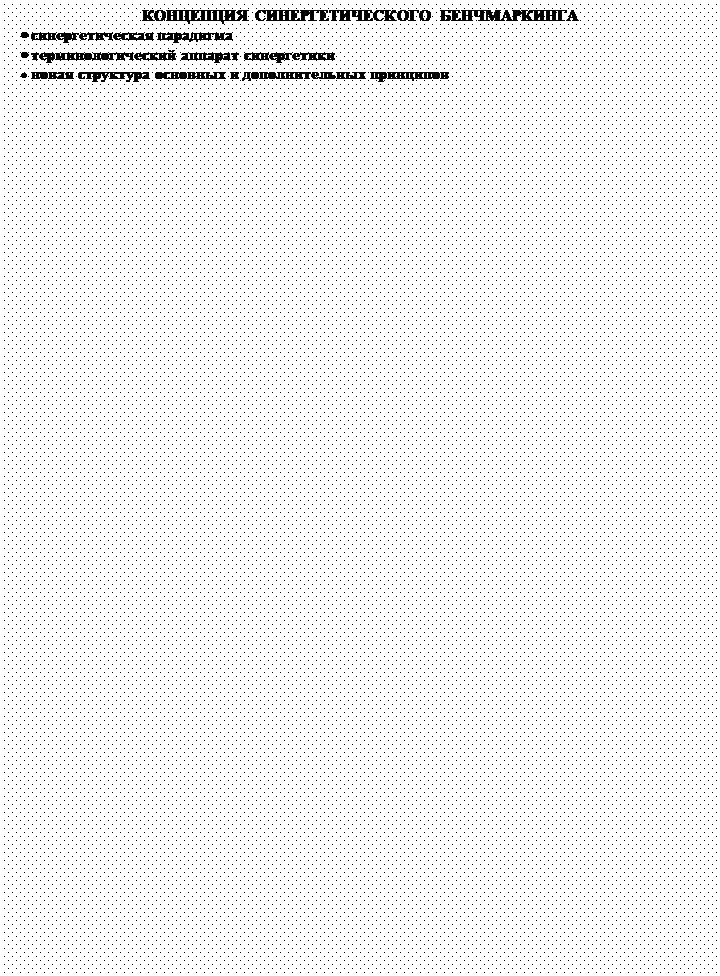 Ниже приводятся положения системы правил синергетики инвариантных к предметной области, которые могут обрабатывать любое проблемное знание, а также принципиальная модель синергетического бенчмаркинга и краткое обоснование научной новизны и ценности разработанной концепции.