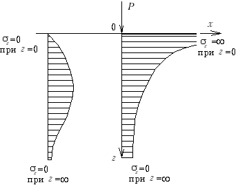 | Рис.М.7.8. Эпюры напряжений s z в полуплоскости и полупространстве по вертикальным и горизонтальному сечениям |