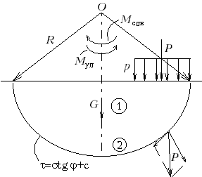 | Рис.М.12.14. Схема для расчета предельной нагрузки в предположении образования круглоцилиндрических поверхностей скольжения |