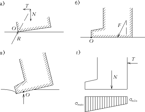 | Рис.М.12.18. Схема для расчета устойчивости на опрокидывение: а - опрокидывание происходит вокруг точки O; б - консоль, увеличивающая сопротивление опрокидыванию; в - опрокидывание вокруг точки O при вдавливании сооружения в основание; г - эпюра нормальных напряжений по подошве фундамента |