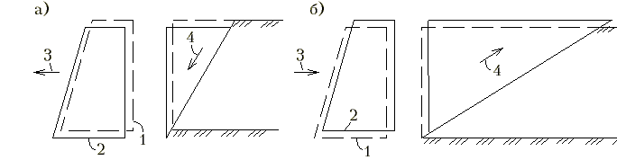 | Рис.М.14.4. Давление грунта на стену: а - активное; б - пассивное:1 - положение до начала перемещения стены; 2 - положение после перемещения стены; 3 - напрваление перемещения стены; 4 - направление движения грунта в призме обрушения |