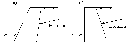 Если задняя грань стены имеет уклон в сторону засыпки, то давление уменьшается (рис.М.14.10,а), в противоположную сторону - увеличивается (рис.М.14.10,б).