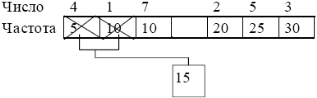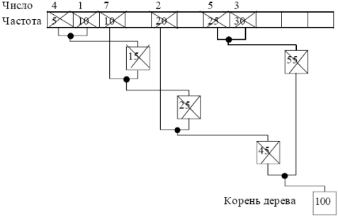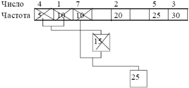 Новый узел и оставшиеся узлы таблицы частот образуют новую таблицу, для которой повторяют операцию добавления узла. Опять самая низкая частота 10 (узел для числа 7) и 15 (новый узел). Снова добавляем узел.