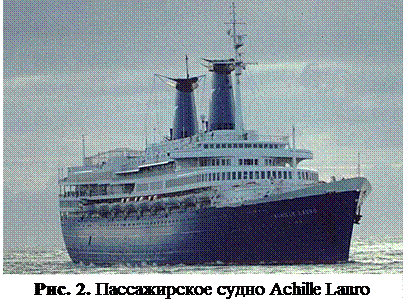 Началом террористической деятельности на морском транспорте принято считать дату 7 октября 1985 года. Четверо террористов Фронта освобождения Палестины Абу Аббаса (Palestine Liberation Front) захватили круизный лайнер Achille Lauro (Рис. 2), в Средиземном море вблизи Египта. Террористы начали операцию ранее планировавшегося времени, их спугнул член экипажа. Однако они сумели взять лайнер под контроль, после чего приказали следовать в Тартус, Сирия. Требование – освободить 50 палестинцев, находившихся в тюрьмах Израиля. Израиль отказался освобождать арестованных, а Сирия отказала в заходе в Тартус. Тогда террористы застрелили пассажира, гражданина США Леона Клингхоффера, инвалида, постоянно находившегося в коляске. Причем после убийства они выбросили тело жертвы, вместе с коляской, за борт. Причина убийства именно этого человека – его национальность, еврей.