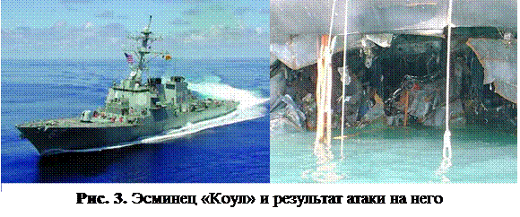 Осенью 2000 года эсминец «Коул» (Рис. 3) в составе Пятого флота ВМС США выполнял задачи по контролю над соблюдением международного эмбарго против Ирака. 12 октября 2000 г., в 9 часов 30 минут (по местному времени) эсминец «Коул» пришвартовался в порту Адена для пополнения запасов воды и продовольствия. В 10 часов 30 минут корабль начал заправляться топливом. В 11 часов 18 минут по местному времени, в то время как команда корабля завтракала в столовой, эсминец «Коул» был атакован моторным катером из фибергласа, управляемым двумя террористами-смертниками и начинённым по оценке экспертов 200 — 230 или даже 300 килограммами взрывчатки в тротиловом эквиваленте.