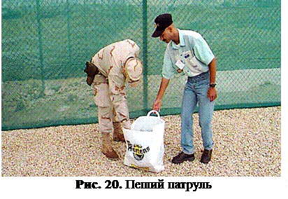 Служба охраны портового средства должна быть способна постоянно, включая ночное время и периоды ограниченной видимости, наблюдать за обстановкой на территории портового средства и на ближних подходах к нему на суше и на воде, за зонами ограниченного доступа в пределах портового средства, за судами в районе портового средства и вокруг них. Наблюдение включает использование: освещения; охранников, включая пешие (см. рис. 20), моторизованные и водные патрули; автоматических устройств обнаружения несанкционированного проникновения и средств наблюдения.