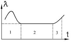 Для количественной оценки надежности чаще всего используют функцию интенсивности отказов λ(t), часто называемой λ – характеристикой. Интенсивность отказов λ(t) является критерием, наиболее полно определяющим надежность неремонтируемых САУ ЛА, а также составляющих их элементов и компонентов (резисторов, конденсаторов, ИС, печатных плат, соединений сваркой, пайкой и т.д.). Идеализированный вариант функции λ(t) приведен на рис. 2.2.