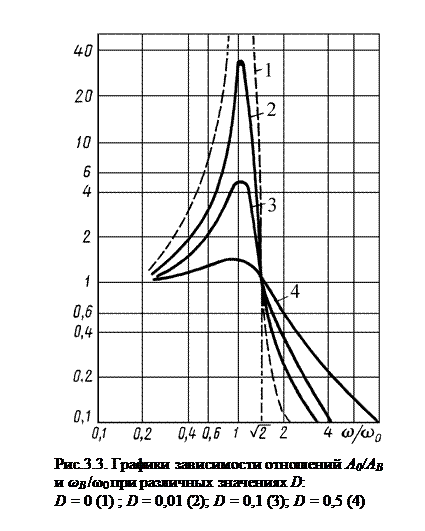 В установившемся режиме под воздействием внешней гармонической силы все точки конструкции совершают в направлении оси Z вынужденные колебания с частотой внешних воздействий – ωВ. Для определения амплитуды точки О (А0) при вынужденных колебаниях необходимо решить уравнение (3.1). На рис. 3.3 приведены примерные решения уравнения (3.1) в виде графиков, показывающих зависимость отношения амплитуд А0 /АВ и отношения частот ωВ /ω0 при различных значениях коэффициента относительного затухания D, определяемого как